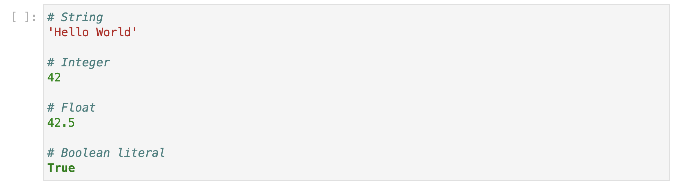 Each of these are example of literals. Just like Excel, Python uses different syntax to define different types of literals. Most importantly, if you want to create a string literal, make sure to put quotes around it!
